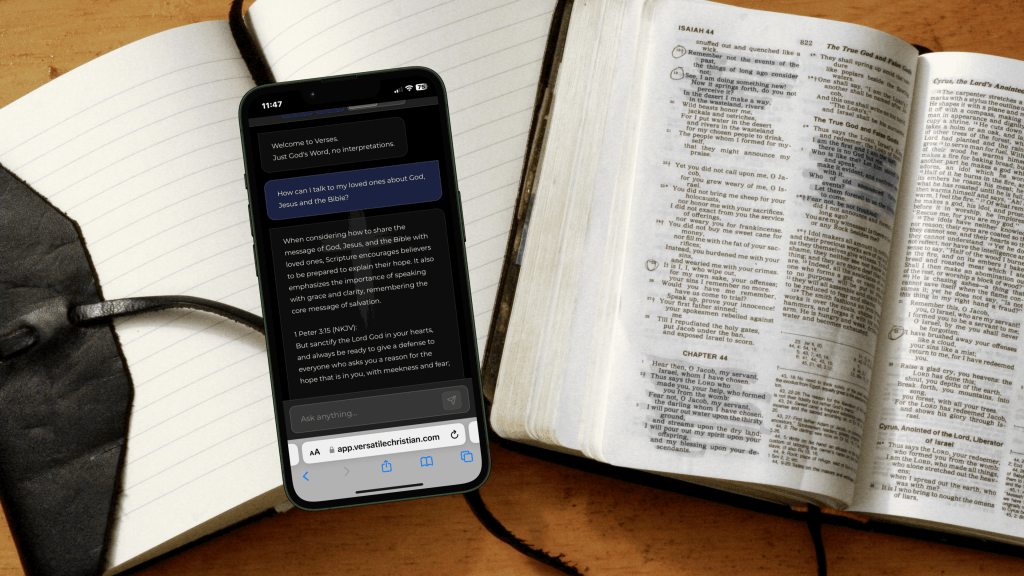 Ask the Verses chat to give you scriptures when wrestling with things like anger, stress and anxiety, gossip, finances, worry, how to be a man or woman of God, and so much more.